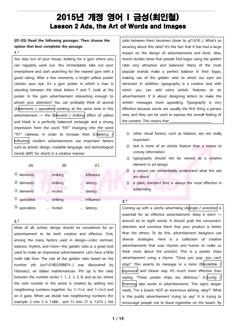 2015년 개정 영어 I 금성(최인철) 2과 변형 문제 Ads, the Art of Words and Images?