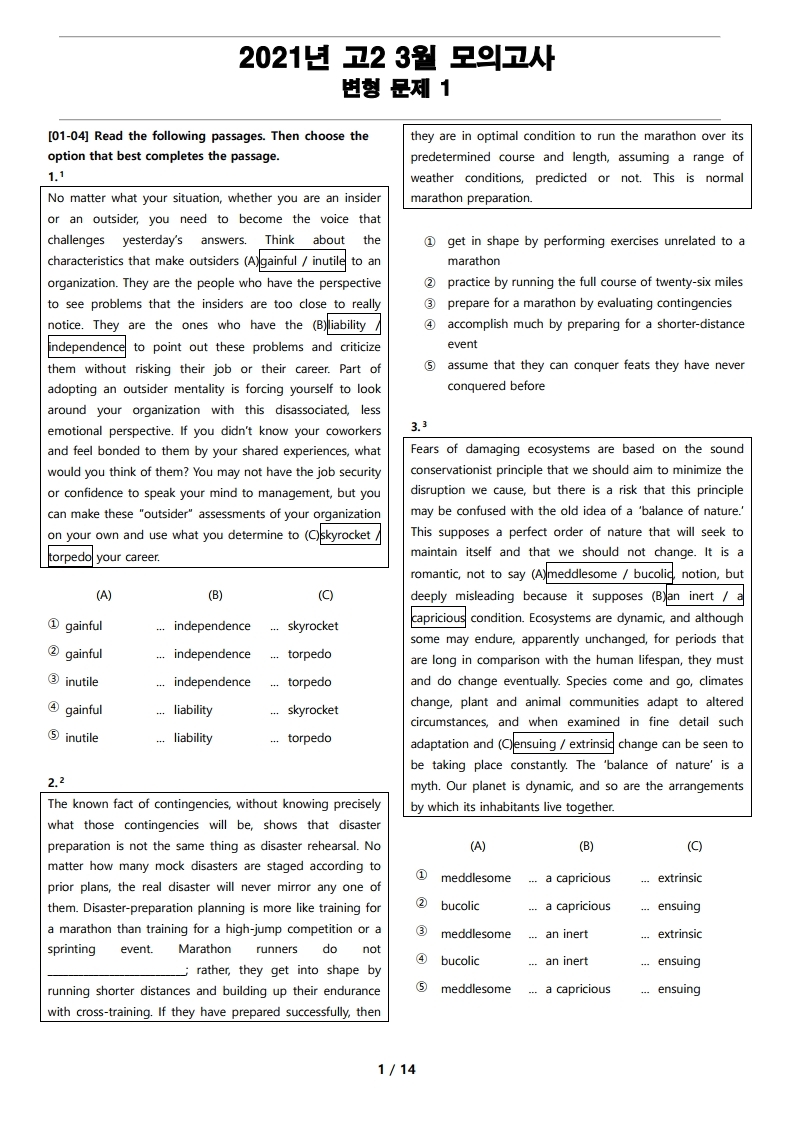 현직에서 강사를 하고 있는 연구진들이 학생들을 위한 최상의 2021년 고2 3월 전국 연합 모의고사 변형 문제 1 를 선보입니다.