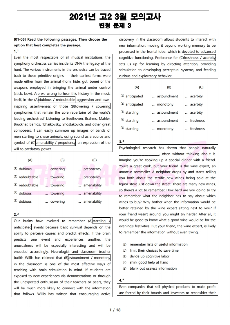 현직에서 강사를 하고 있는 연구진들이 학생들을 위한 최상의 2021년 고2 3월 전국 연합 모의고사 변형 문제 3을 선보입니다.