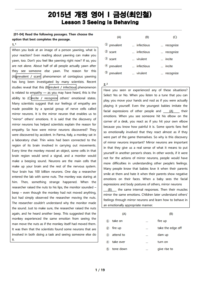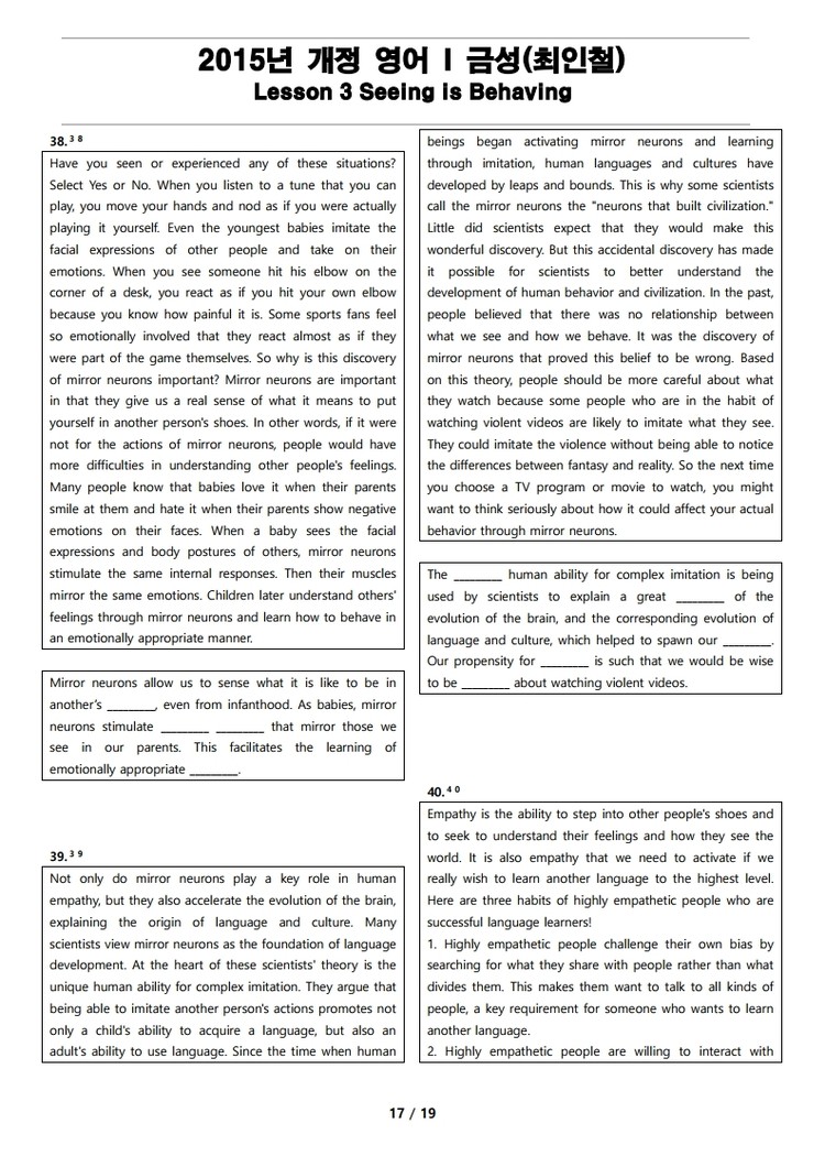 2015년 개정 영어 I 금성(최인철) 3과 변형 문제 Seeing is Behaving
