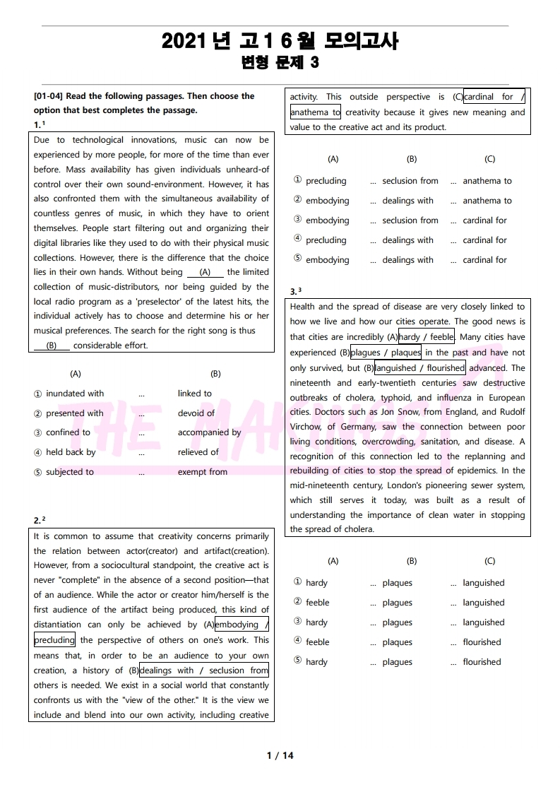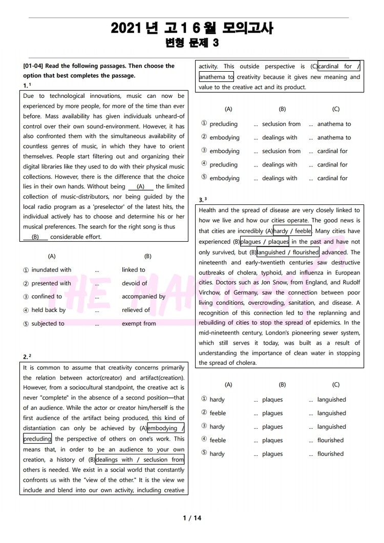 현직에서 강사를 하고 있는 연구진들이 학생들을 위한 최상의 2021년 고1 6월 전국 연합 모의고사 변형 문제 3 를 선보입니다.