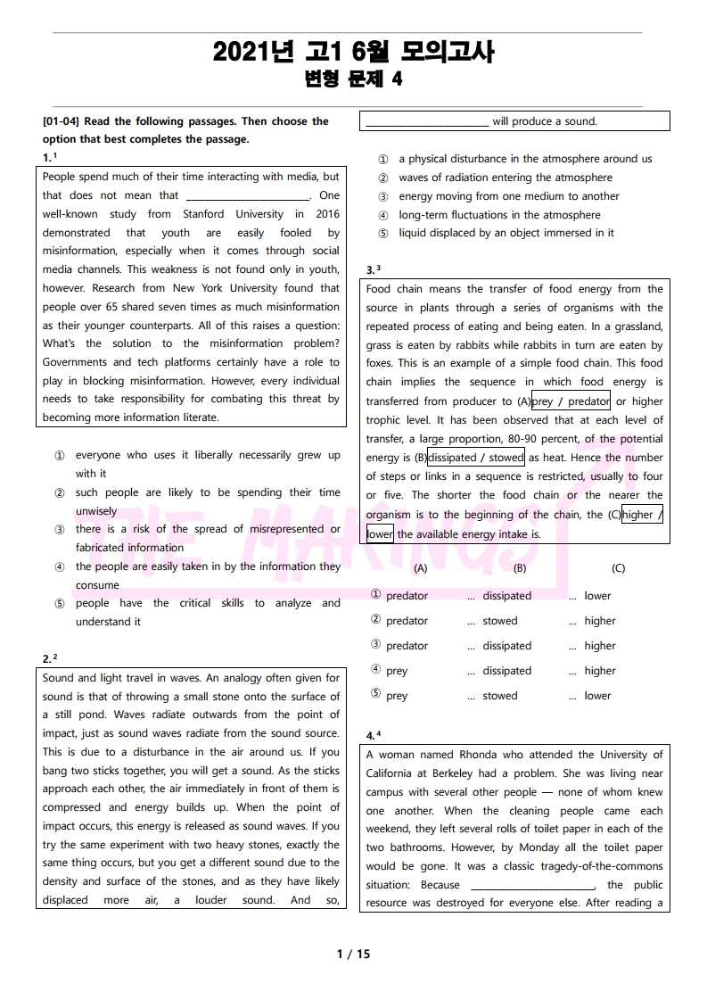 일반 워크북 형태의 문제에서 벗어나 The Makings가 만든 2021년 고1 6월 전국 연합 모의고사 변형 문제 4