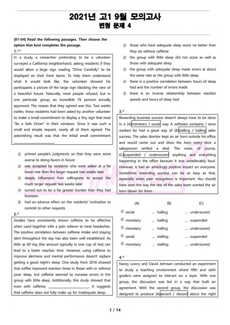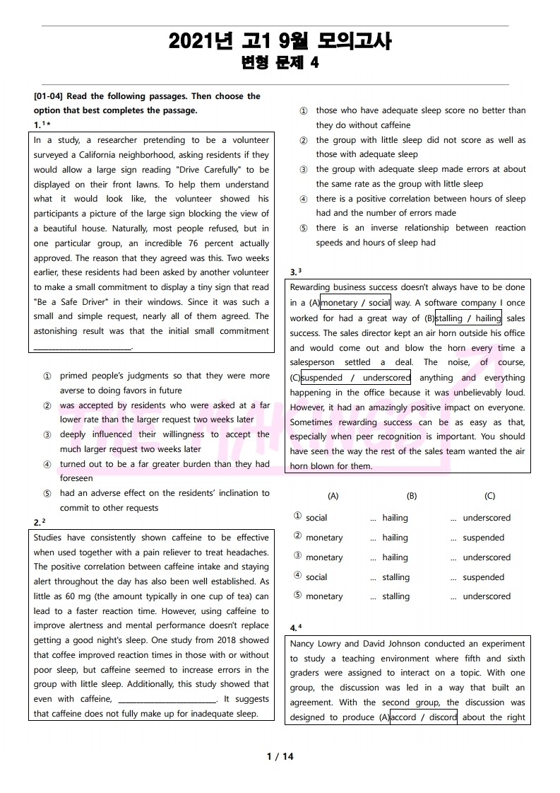 현직에서 강사를 하고 있는 연구진들이 학생들을 위한 최상의 2021년 고1 9월 전국 연합 모의고사 변형 문제 4를 선보입니다.