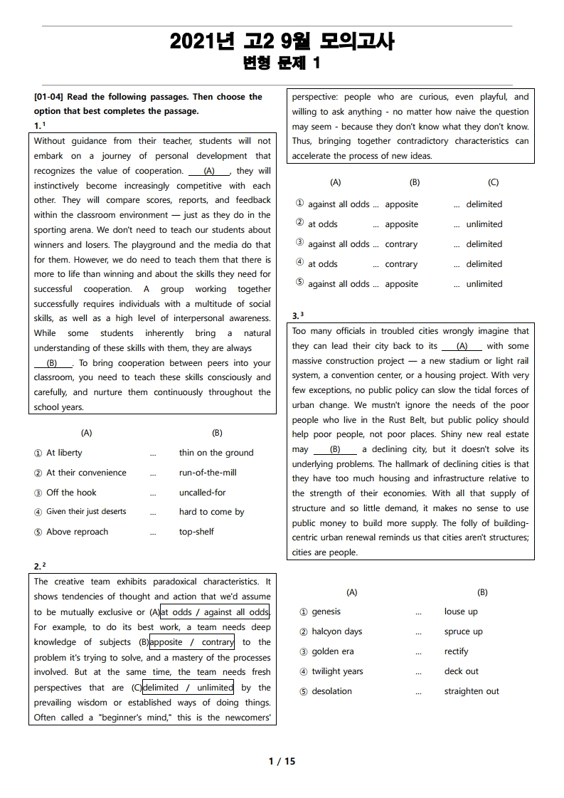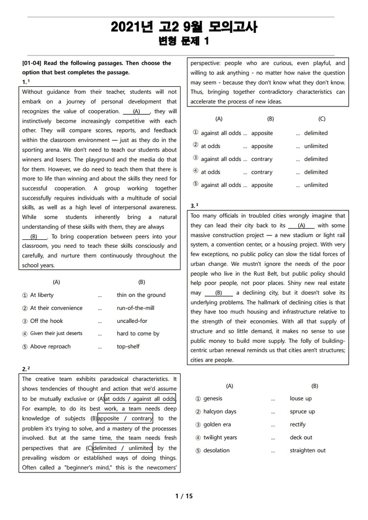 현직에서 강사를 하고 있는 연구진들이 학생들을 위한 최상의 2021년 고2 9월 전국 연합 모의고사 변형 문제 1 를 선보입니다.