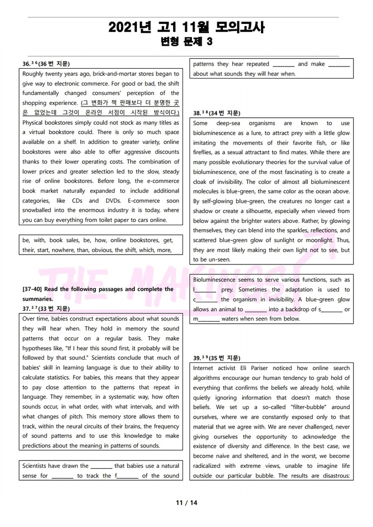 일반 워크북 형태의 문제에서 벗어나 The Makings가 만든 2021년 고1 11월 전국 연합 모의고사 변형 문제 3