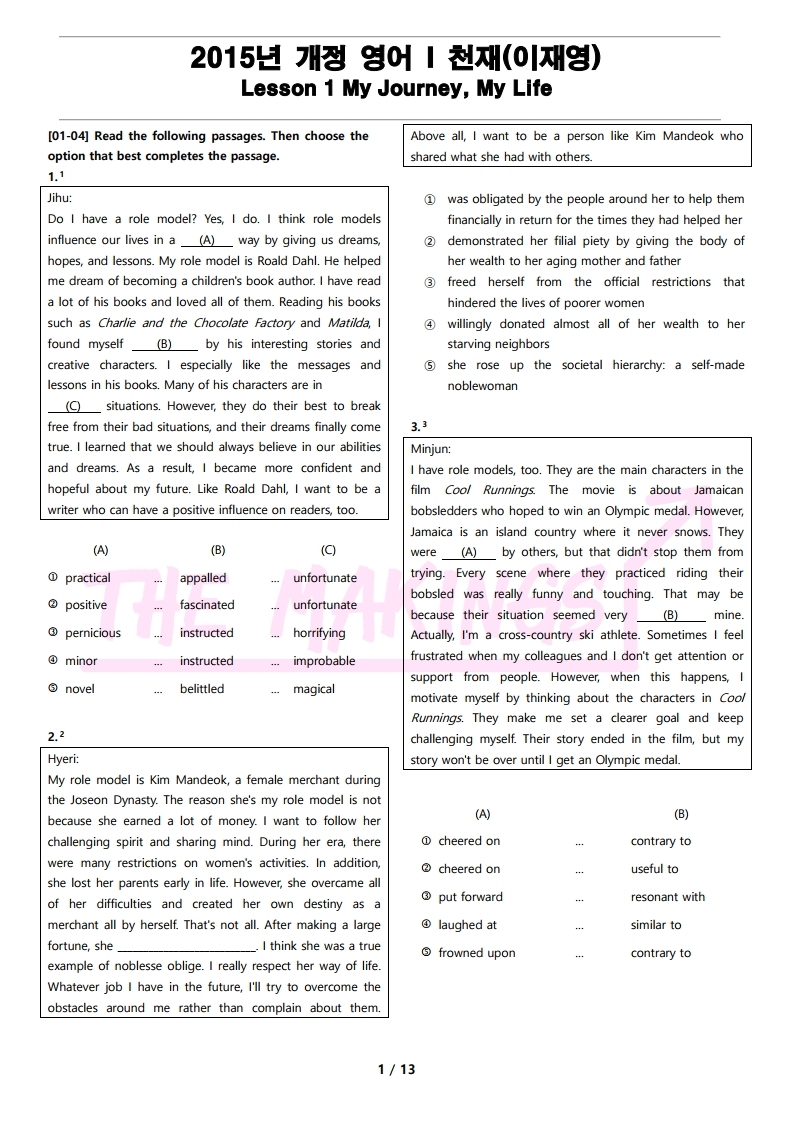 2015년 개정 영어 I 천재(이재영) 1과 변형 문제 My Journey, My Life