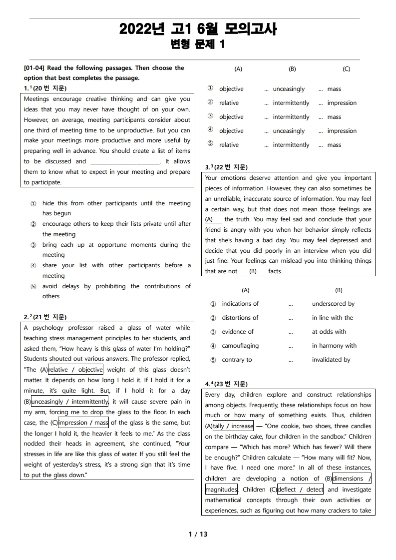 현직에서 강사를 하고 있는 연구진들이 학생들을 위한 최상의 2022년 고1 6월 전국 연합 모의고사 변형 문제 1 을 선보입니다.