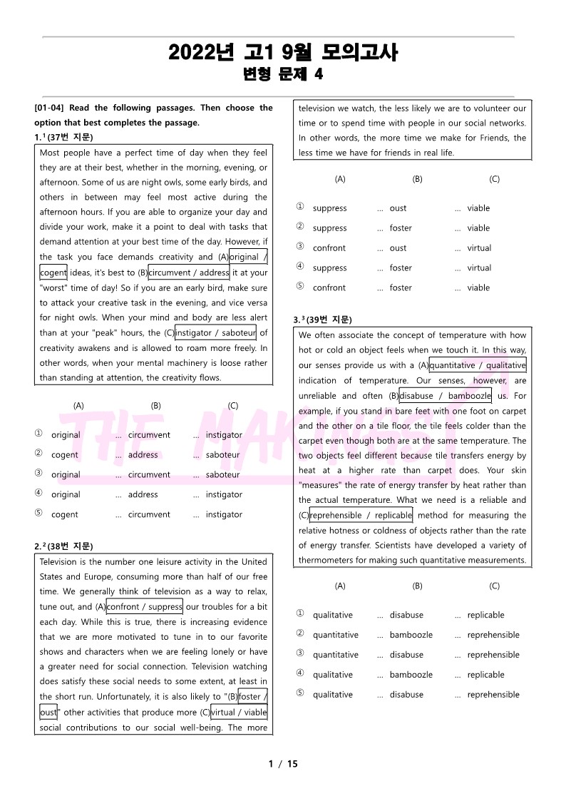 현직에서 강사를 하고 있는 연구진들이 학생들을 위한 최상의 2022년 고1 9월 전국 연합 모의고사 변형 문제 4을 선보입니다.