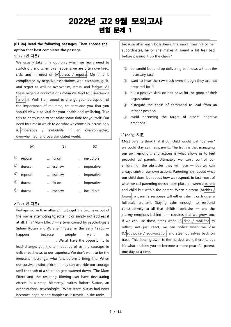 일반 워크북 형태의 문제에서 벗어나 The Makings가 만든 2022년 고2 9월 전국 연합 모의고사 변형 문제 1