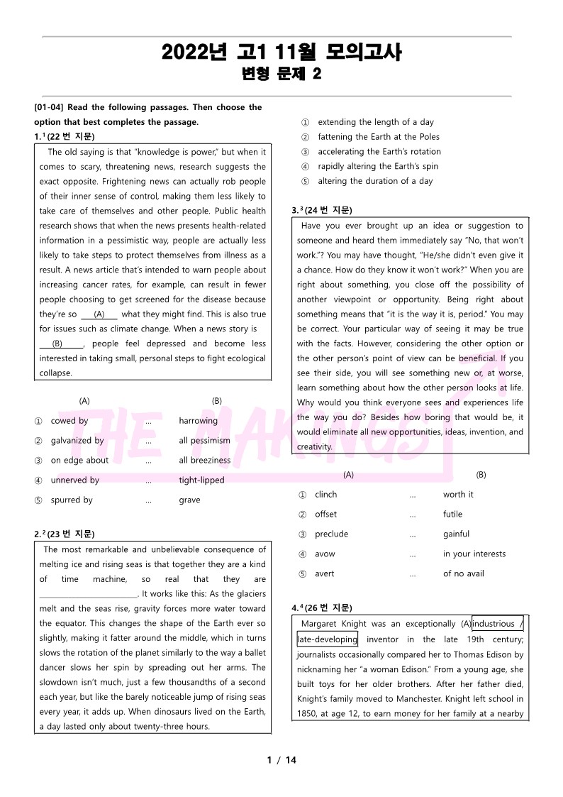 현직에서 강사를 하고 있는 연구진들이 학생들을 위한 최상의 2022년 고1 11월 전국 연합 모의고사 변형 문제 2 를 선보입니다.