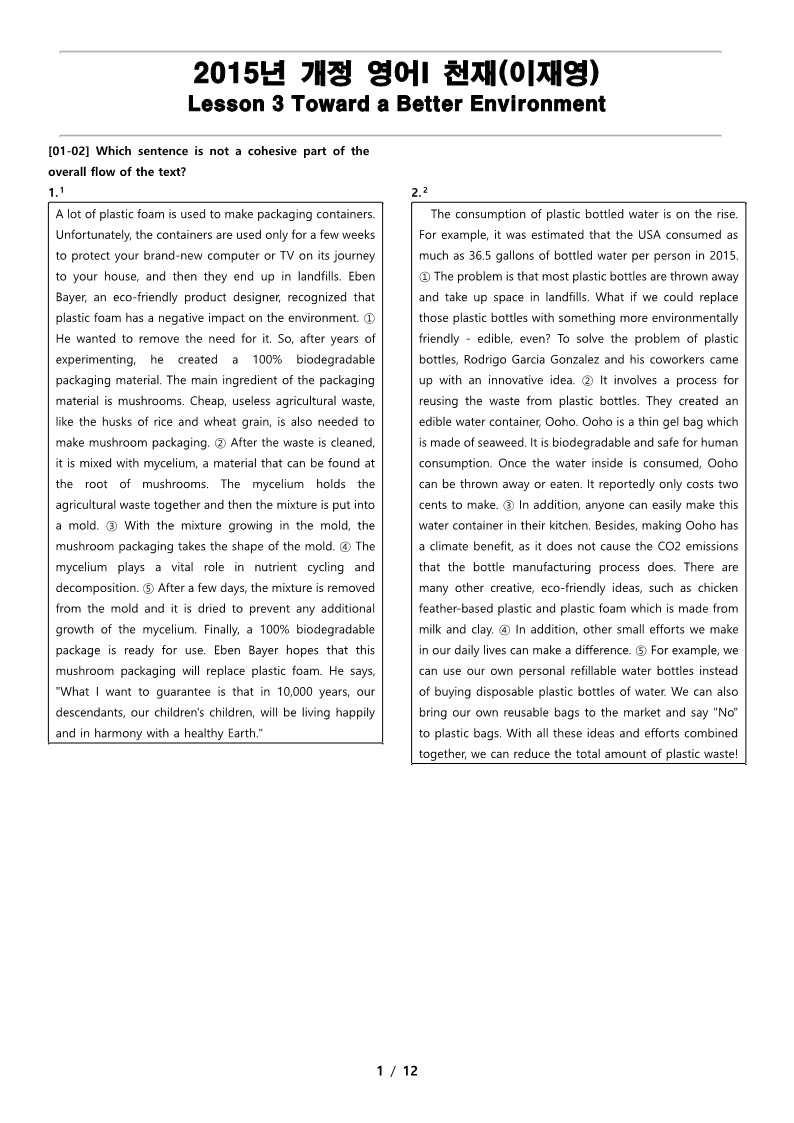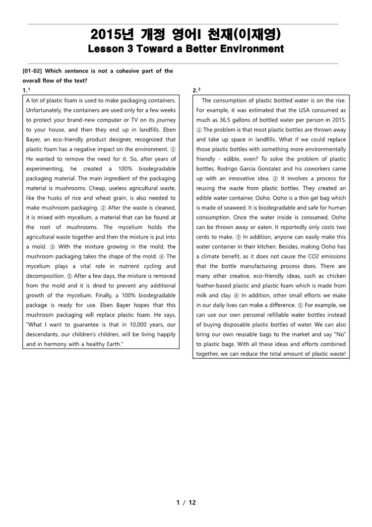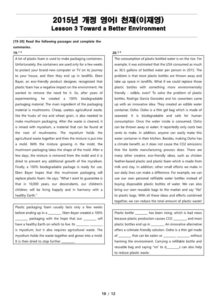 2015년 개정 영어 I 천재(이재영) 3과 변형 문제 Toward a Better Environmnet