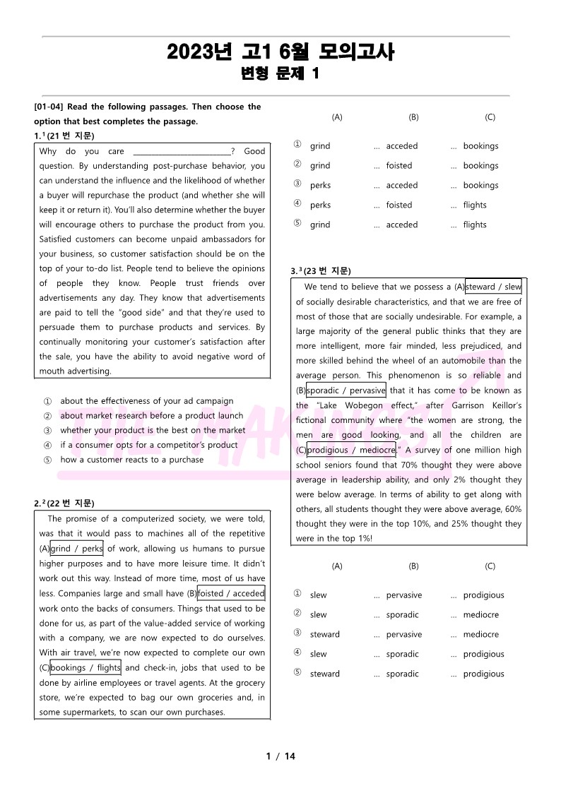 현직에서 강사를 하고 있는 연구진들이 학생들을 위한 최상의 2023년 고1 6월 전국 연합 모의고사 변형 문제 1 을 선보입니다.