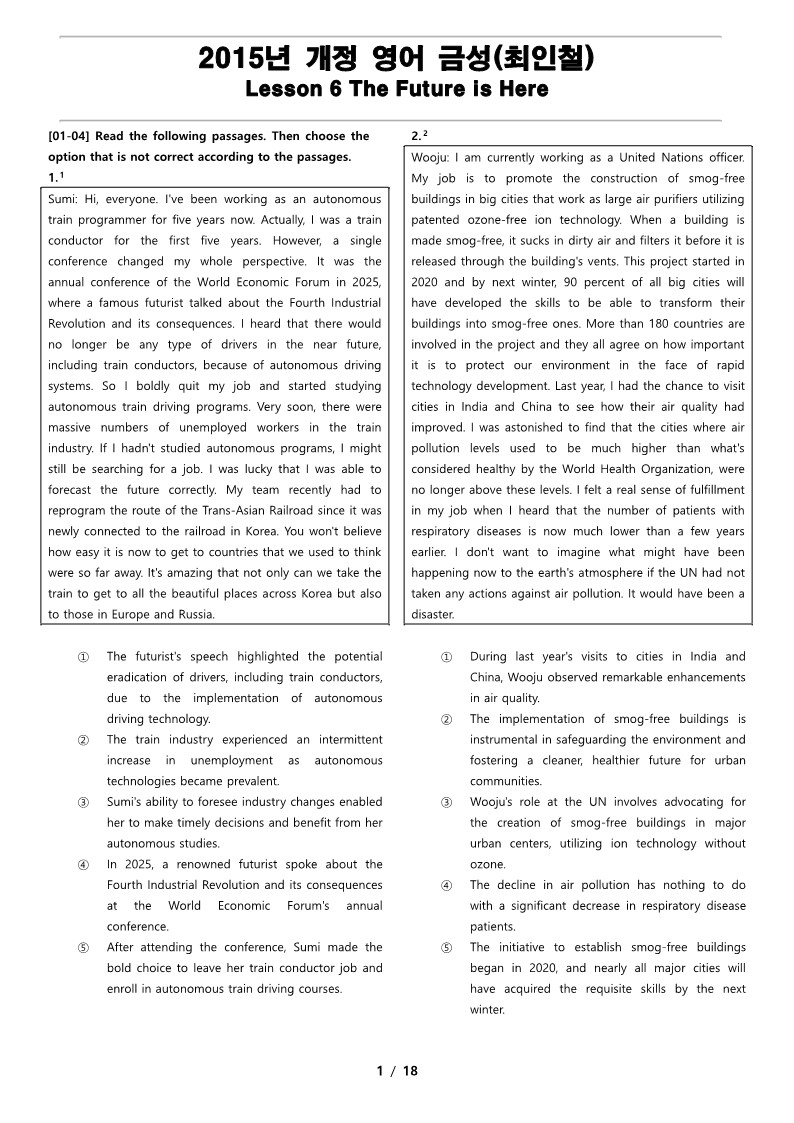 2015년 개정 영어 II 금성(최인철) 6과 변형 문제 The Future Is Here