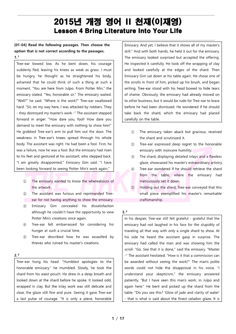 2015년 개정 영어 II 천재(이재영) 4과 변형 문제 Bring Literature Into Your Life